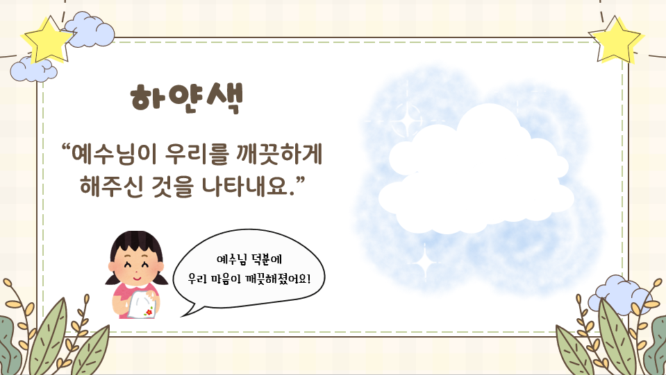 | ⚪ 하양 | 깨끗함 | 예수님을 믿으면 죄가 씻기고 새 사람이 돼요. |
