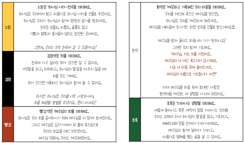 - 노란색 : 천국을 의미해요. 우리는 예수님과 함께 영원히 살 천국을 약속받았어요.