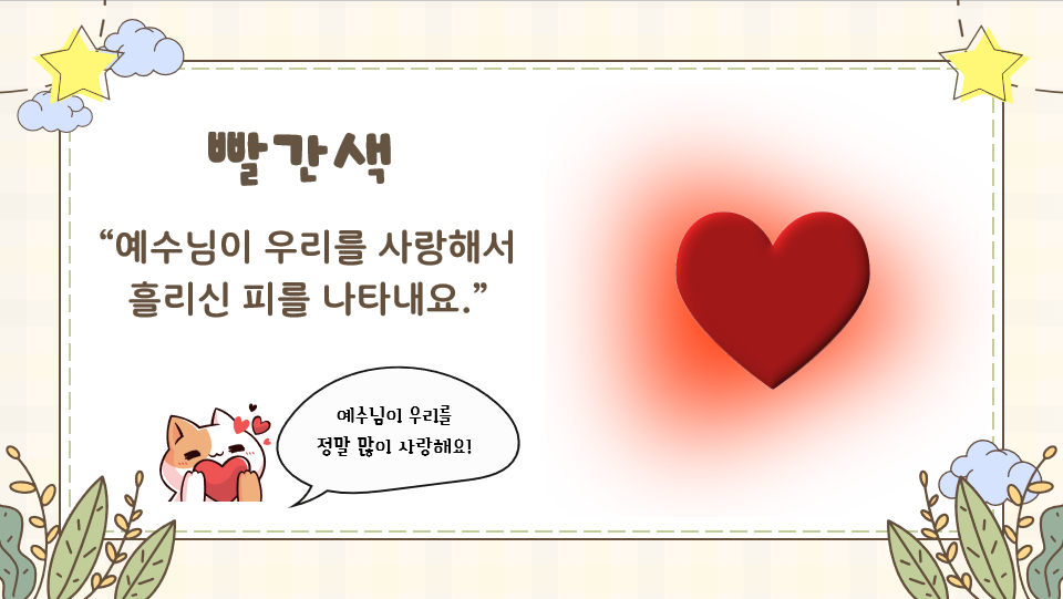 - 빨간색 : 예수님의 피를 의미해요. 예수님이 우리의 죄를 용서해 주시기 위해 십자가에서 흘리신 사랑의 피에요.