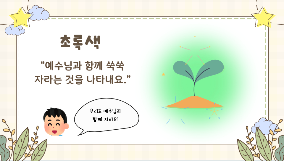 - 초록색 : 성장을 의미해요. 성경읽고 기도하고 예배하며 매일매일 자라서 하나님을 닮아가요.